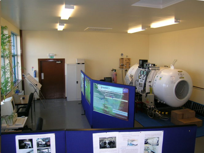 The university’s chamber was housed in a container for easy of transport to where ever it was needed to cover diving operations. Initially, when the Dive Unit was relocated from Edinburgh to Orkney it was located at the Orkney Water Test Centre at the Flotta Oil Terminal before moving across to the International Centre for Island Technology in Stromness once renovations at the Old Academy were completed.